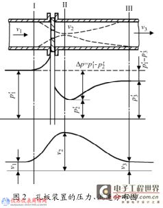 充滿管道的流體流經(jīng)管道內(nèi)的節(jié)流裝置,由于節(jié)流元件造成的流束局部收縮,使管中心流體流速發(fā)生變化,其靜壓力隨之變化。由于流體流經(jīng)孔板時(shí),產(chǎn)生局部渦流損耗和摩擦阻力損失,在流束充分恢復(fù)后,靜壓力不能恢復(fù)到原來的數(shù)值。節(jié)流元件前后的靜壓差大小與流量有關(guān),流量愈大,流束的收縮和動(dòng)、靜壓能的轉(zhuǎn)換也愈顯著,則產(chǎn)生的壓差也愈大。只要測得節(jié)流元件前后的靜壓差大小,即可確定流量,這就是節(jié)流裝置測量流量的基本原理,如圖2 所示。這種測量方法是以能量守恒定律和流動(dòng)連續(xù)性方程為基礎(chǔ)的。