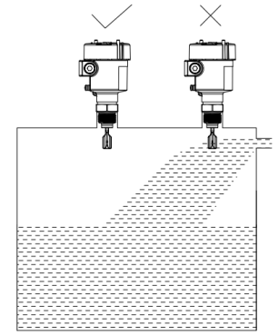 如圖2,選擇音叉液位開關(guān)的安裝位置時,應(yīng)避免由于安裝在入料口位置而造成的測量誤差,甚至損壞儀表。
