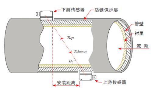 從上式可看出發(fā)生器發(fā)出的超聲波傳到接收器的時(shí)間變化與管路內(nèi)的流體流速成正比。據(jù)此把管道參數(shù)置入儀器,采集數(shù)據(jù)經(jīng)變換器變換即得到瞬時(shí)流量,并得累計(jì)流量。