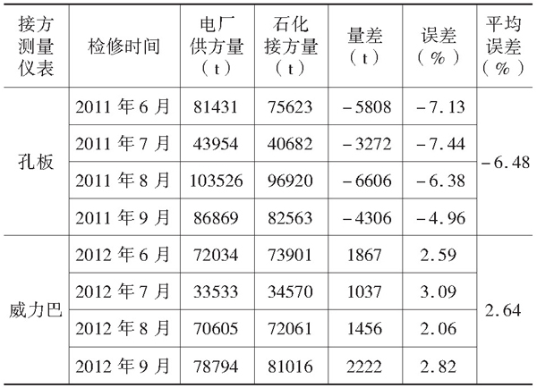 2011年我公司剛檢修完畢,在各裝置都陸續(xù)投入使用期間,發(fā)現(xiàn)公司接電廠中壓蒸汽的計量監(jiān)督表量偏低于電廠表量,最多低至-7.44%。通過對供接雙方計量儀表、差壓變送器、導(dǎo)壓系統(tǒng)、顯示儀表的運行狀態(tài)以及技術(shù)參數(shù)設(shè)置進(jìn)行查看核實后,發(fā)現(xiàn)我公司的孔板流量計量程范圍不能滿足測量裝置檢修前后蒸汽變化量的計量技術(shù)要求,再加之孔板由于使用時間較長, 測量準(zhǔn)確度也達(dá)不到貿(mào)易交接的計量要求,所以導(dǎo)致比對誤差較大。通過認(rèn)真核對工藝參數(shù),為此計量點設(shè)計安裝了一臺威力巴流量計,在2012年檢修期間,發(fā)現(xiàn)我公司計量監(jiān)督表與電廠的計量表量差大幅度降低,基本控制在允許誤差范圍之內(nèi)。計量儀表誤差比對如表1所示。