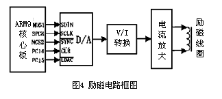 電磁流量計的勵磁電路的任務(wù)是向勵磁線圈提供一穩(wěn)定的驅(qū)動電流。電流波形為方波、三值方波和梯形波[11]等形式,波形變化的目的是結(jié)合信號處理電路,分析在不同勵磁方式下電磁流量計的精確度、零點穩(wěn)定性和抗干擾能力等多項指標(biāo)。為研制高精度電磁流量計作探索性研究。該電路由核心板的SPI2口輸出數(shù)字量,經(jīng)過D/A轉(zhuǎn)換形成模擬信號,經(jīng)V/I轉(zhuǎn)換激勵和帶有電流負(fù)反饋的電流放大器輸出,適合各種勵磁波形的變化。結(jié)構(gòu)框圖如圖4。
