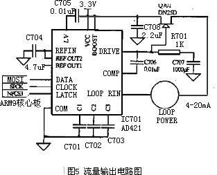 電磁流量計在實現(xiàn)測量、分析和處理的時候,除了現(xiàn)場顯示瞬時流量和累積流量以外,通常還會輸出一個標(biāo)準(zhǔn)的4~20mA電流信號。因此,該電路利用AD421轉(zhuǎn)換電路實現(xiàn)了流量輸出的功能。