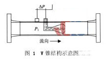 如圖1所示,V錐流量傳感器是由與管道同軸的內(nèi)部節(jié)流件V錐和取壓裝置組成的,流體經(jīng)過時(shí)并不是像孔板那樣突然改變流體的流動狀態(tài),而是介質(zhì)隨著錐體的方向向邊壁收縮,該錐體起到了調(diào)整介質(zhì)流動狀態(tài)的作用,重塑了流束曲線,使流體的流動更加穩(wěn)定。而且由于慣性力的存在,介質(zhì)經(jīng)過V錐的邊緣時(shí)并不直接沖刷錐體邊緣,因此V錐的邊緣不像孔板那么容易磨損,V錐的使用壽命長。由于V錐特有的結(jié)構(gòu),V錐流量計(jì)有許多優(yōu)于孔板流量計(jì)的特點(diǎn)。